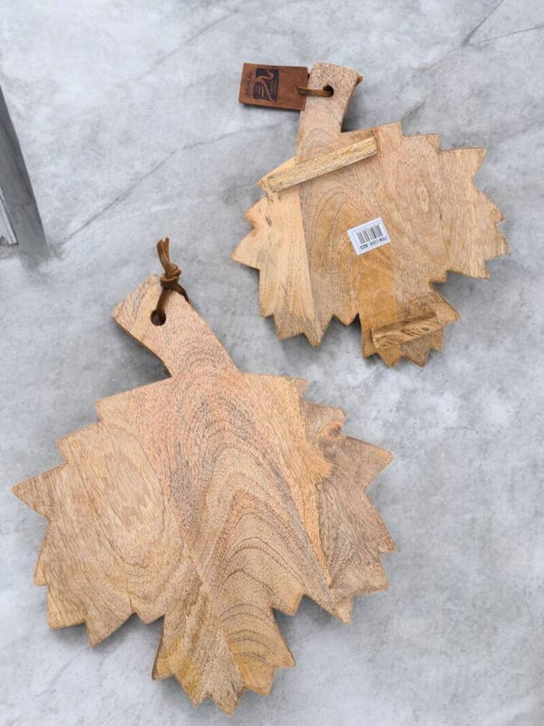 Mangohouten serveerplankje vorm van esdoornblad.