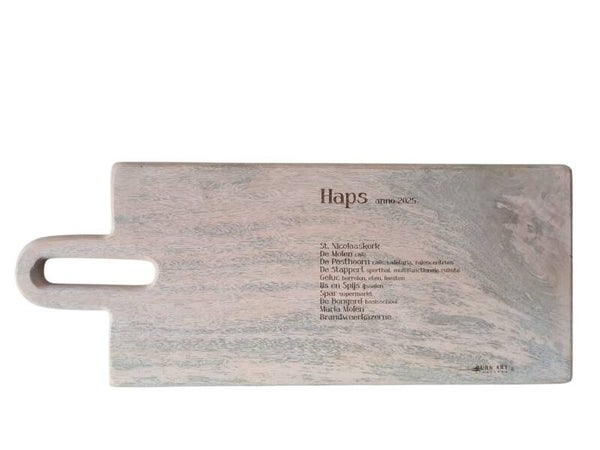 Breng een stukje Haps in huis met deze prachtige langwerpige serveerplank, voorzien van de unieke skyline van het dorp. Een echte eyecatcher op tafel en een perfect cadeau voor iedere Hapse inwoner, ex-inwoner of liefhebber van dit gezellige dorp.